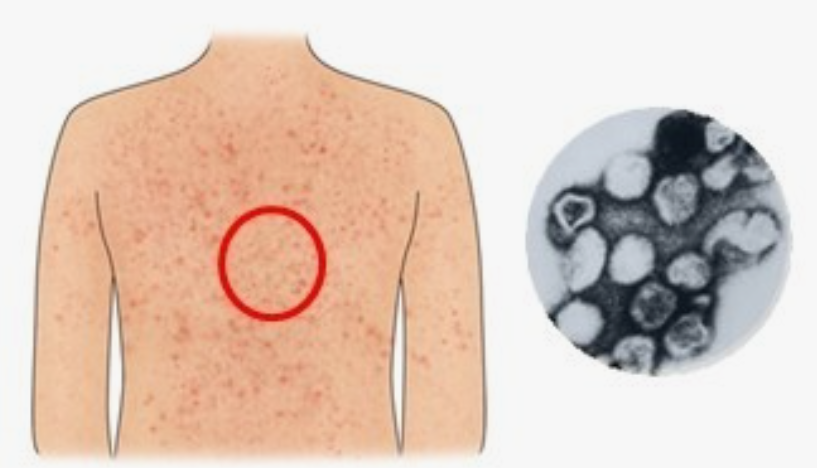 얼굴에서 시작하여 신체의 하부로 퍼지는 홍반성 구진 (사마귀처럼 불룩 튀어나옴)